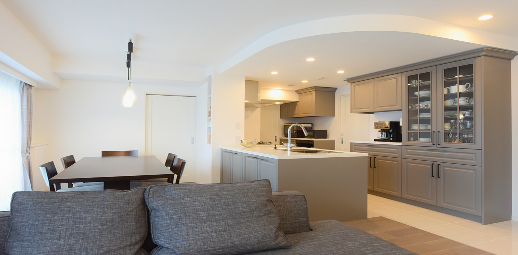 グレイッシュカラーのカウンターキッチンはCUCINAを採用。天板には天然石の風合いと優れた耐久性をもつクォーツストーンを使用しました。 座りやすくお食事がし易い様に、手前側に向かって徐々に幅が広がる設計にしています。